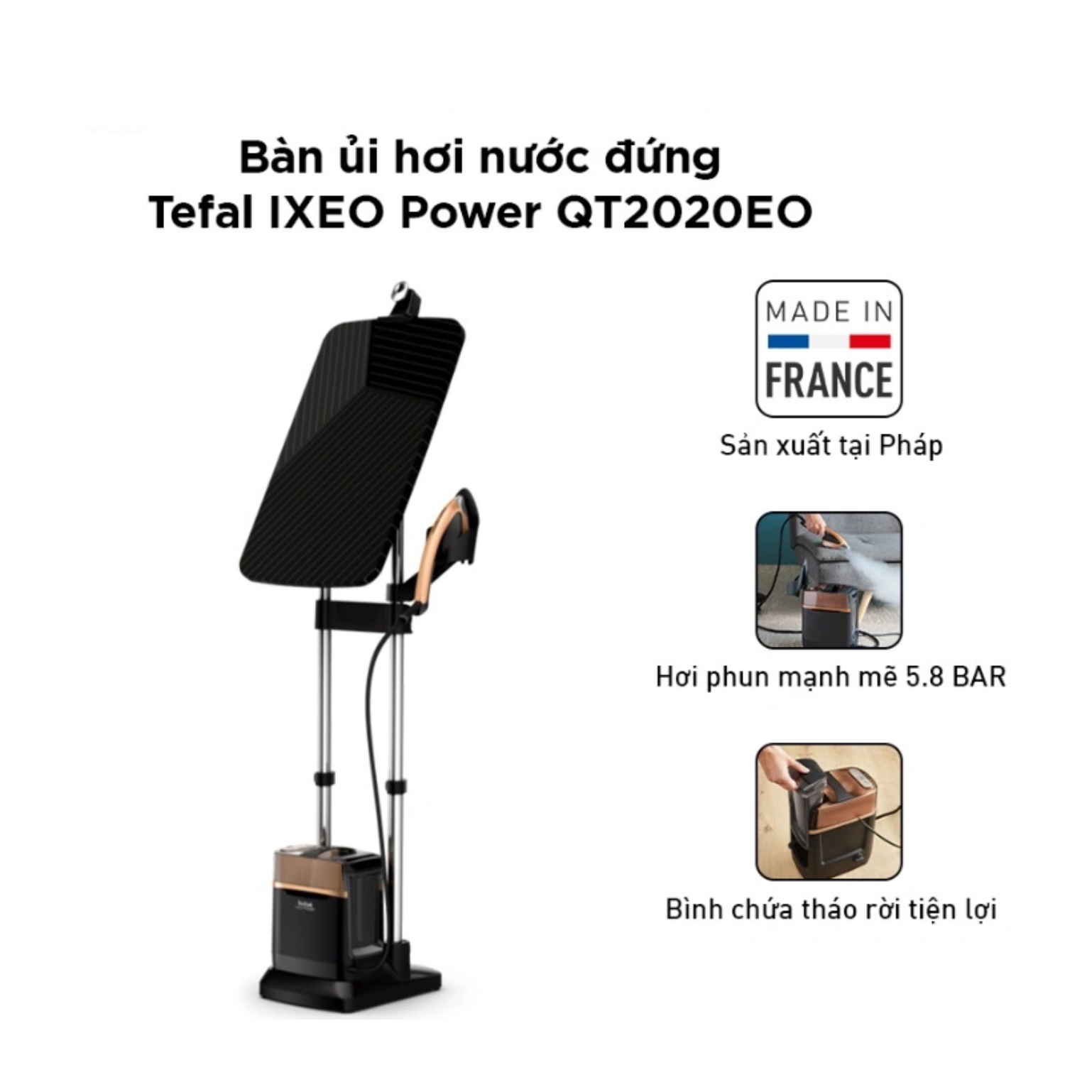 Bàn ủi hơi nước đa năng Tefal QT2020E0 nổi bật với thiết kế hiện đại, bảng ủi thông minh có thể gập 3 tư thế khác nhau phù hợp cho nhiều kiểu ủi: ủi đứng, ủi treo và ủi ngang. Sản phẩm có công suất mạnh mẽ lên đến 2170W, làm nóng nhanh trong 70 giây và phun hơi nước mạnh với áp suất 5.8 bar, lượng hơi nước liên tục 90 g/phút và tăng cường đến 200 g/phút, giúp làm phẳng nhanh nếp nhăn trên mọi chất liệu vải.