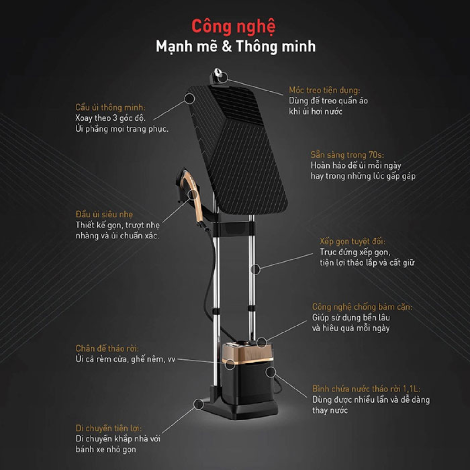 - Tính năng: Ủi đứng, ủi treo, ủi ngang, chống nhỏ giọt, tự động ngắt điện