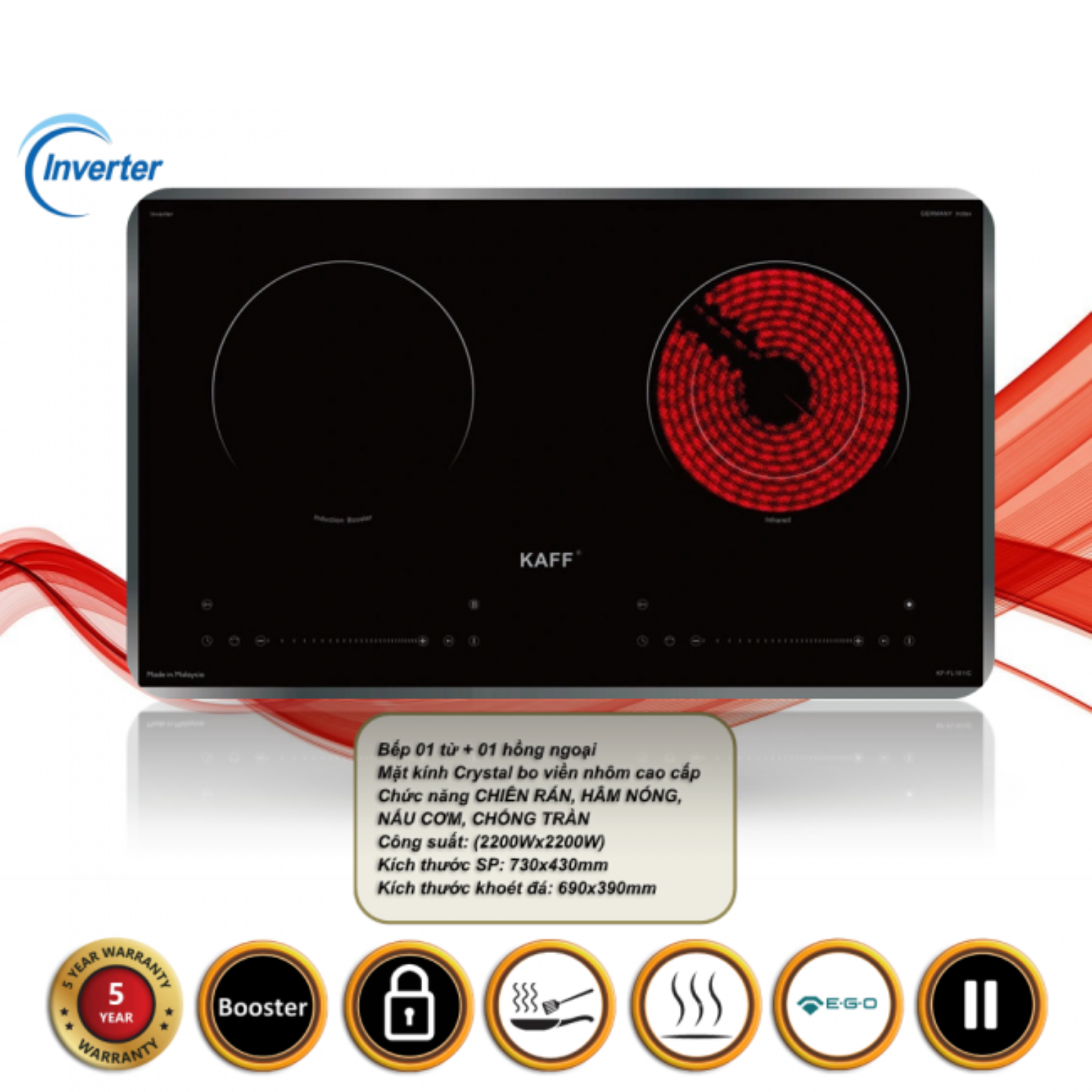 - Chức năng: Booster nấu nhanh, hẹn giờ, khóa trẻ em, chống tràn, cảm ứng quá nhiệt