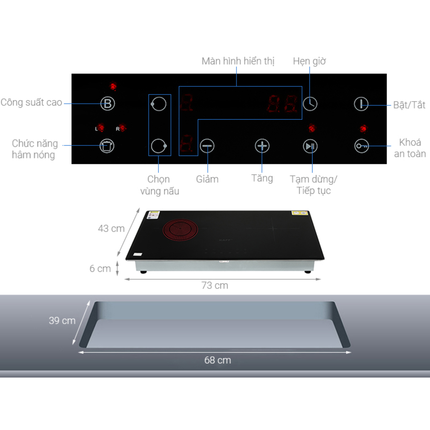 - Tích hợp nhiều chức năng tiện ích: Hẹn giờ nấu độc lập từng vùng, chức năng tạm dừng (Pause), khóa trẻ em an toàn, cảm ứng quá nhiệt, cảnh báo nhiệt dư vùng nấu tránh bỏng, chế độ chống tràn bảo vệ bếp.