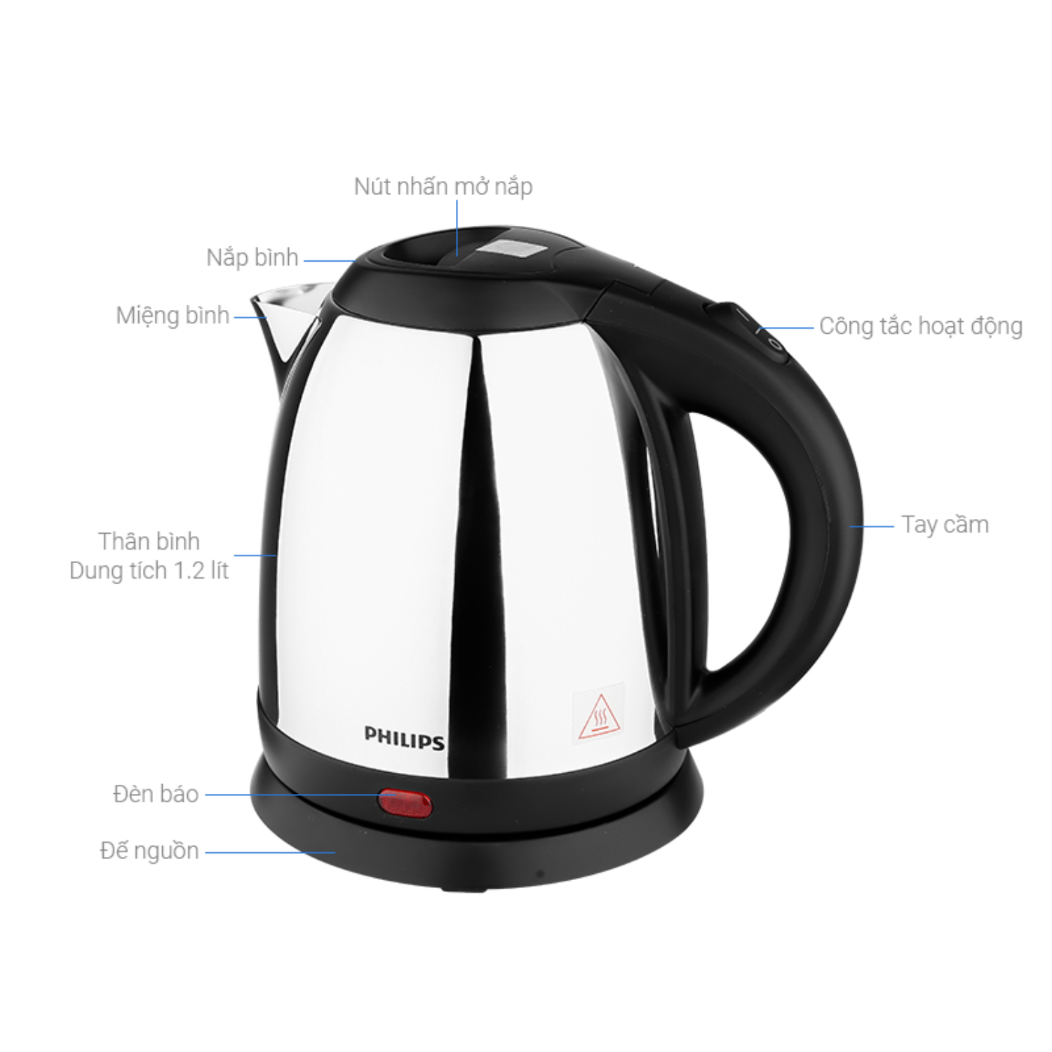 Bình đun siêu tốc Philips có công suất hoạt động 1800W kết hợp mâm nhiệt dần nhiệt tốt, giúp bạn nấu nước nhanh chỉ trong vài phút.