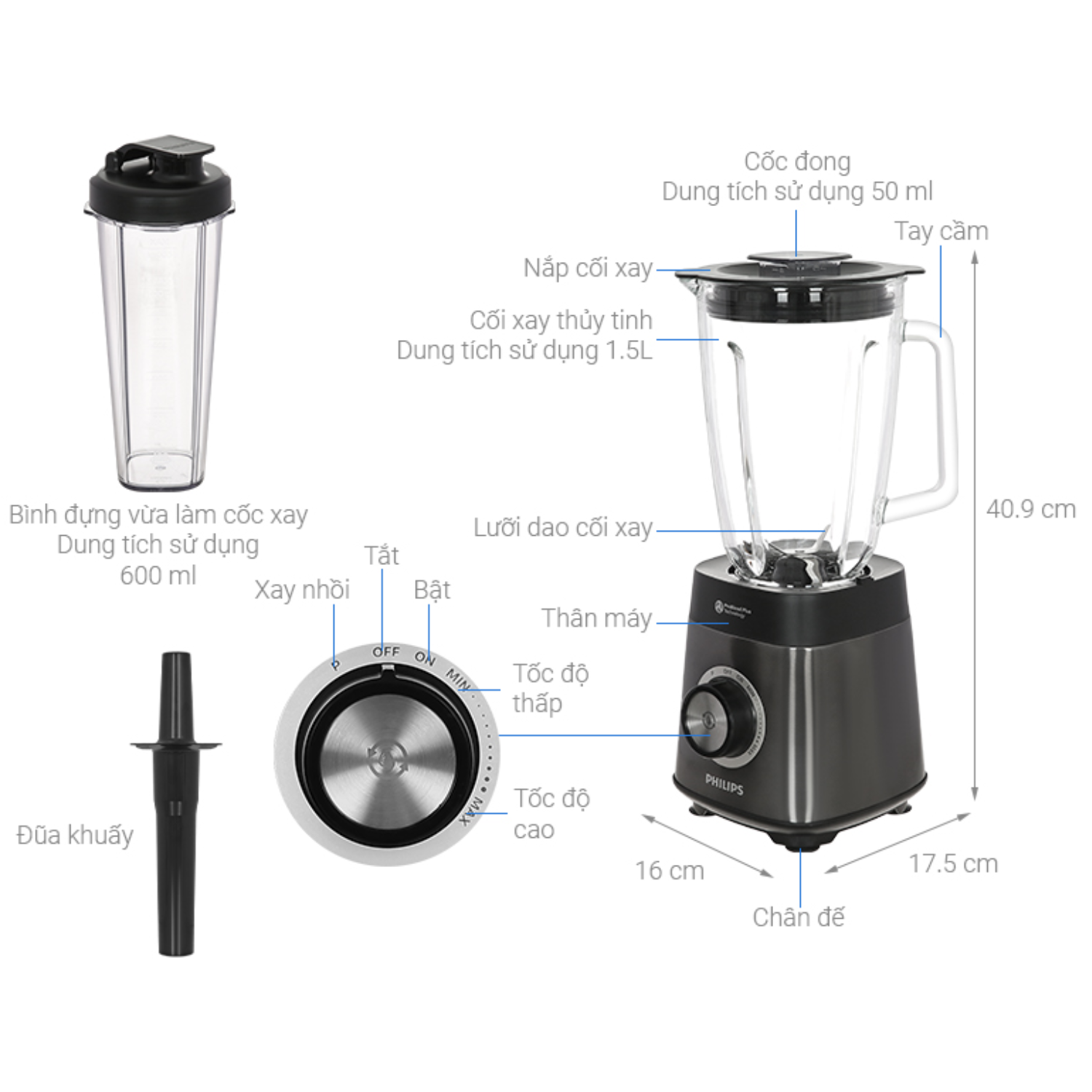 - Dung tích cối: 2 lít (dung tích sử dụng 1.5 lít)