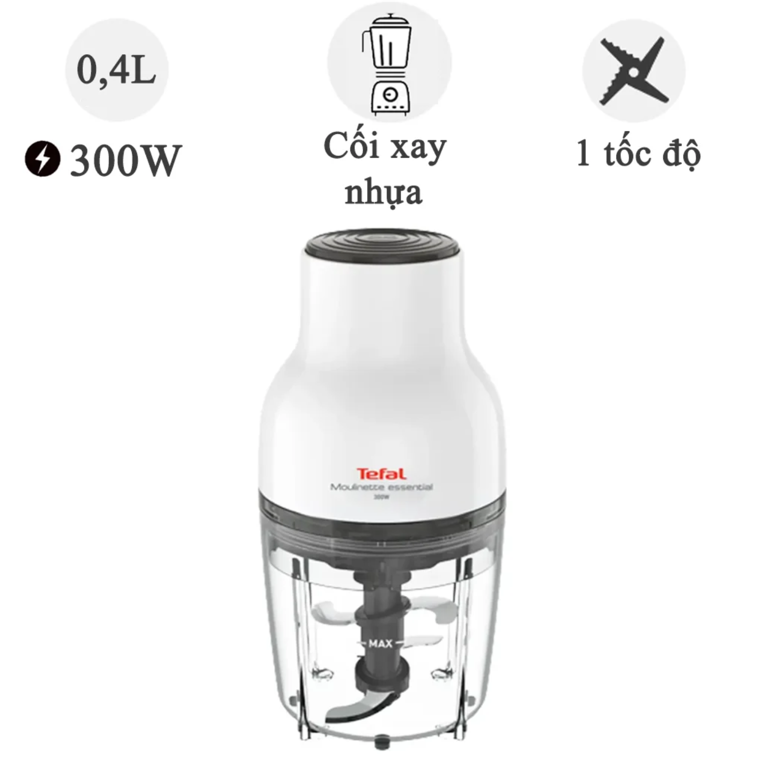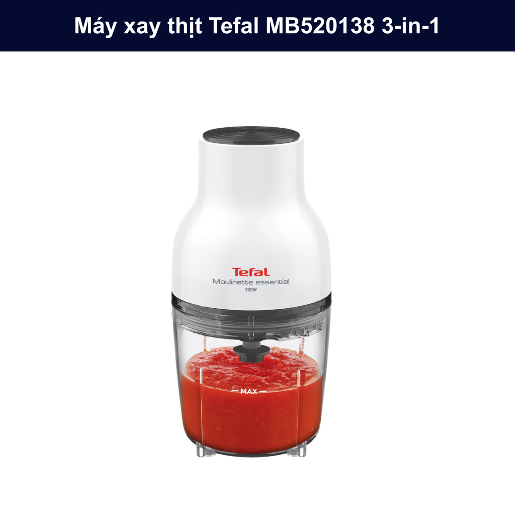 Máy xay thịt Tefal MB520138 là thiết bị 3-in-1 đa năng với công suất 300W, dung tích cối xay 0.4L nhỏ gọn, phù hợp cho việc xay, băm và trộn thực phẩm nhanh chóng trong gian bếp gia đình. Máy có thiết kế hiện đại với màu trắng tinh tế, cối xay bằng nhựa trong suốt giúp dễ dàng quan sát thực phẩm bên trong, dễ dàng tháo lắp và vệ sinh.