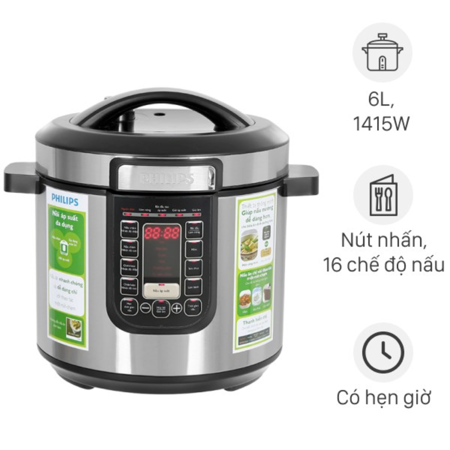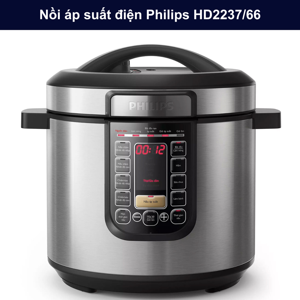 Nồi áp suất điện Philips HD2237/66 dung tích 6 lít, công suất 1300W, phù hợp cho gia đình 4-6 người, có thể nấu gà nguyên con 1.2-1.5 kg nhanh chóng và tiết kiệm thời gian. Máy tích hợp 16 chương trình nấu đa dạng như nấu áp suất, nấu chậm nhiệt độ thấp và cao, chiên/xào, hầm, hấp, nấu cơm, làm bánh, sữa chua, giữ ấm... giúp đa dạng hóa các món ăn gia đình.