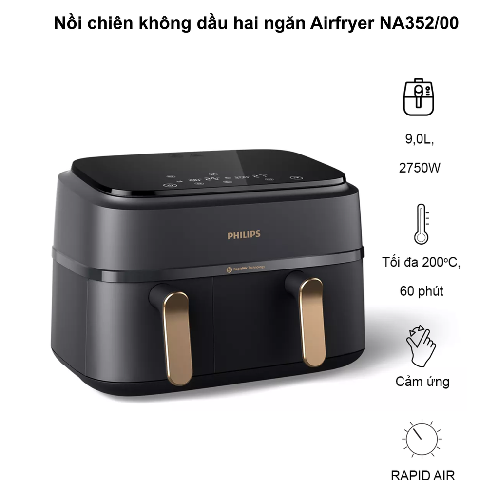 Nồi Chiên Không Dầu Philips NA352/00 sở hữu các tính năng vượt trội như thiết kế 2 ngăn tiện lợi, công suất hoạt động lên tới 2750W, dung tích 9L, sản phẩm mang lại những bữa ăn ngon miệng và lành mạnh cho gia đình. Bạn có thể tham khảo thêm sản phẩm Nồi chiên Philips HD9200/90 với dung tích 4.1L.