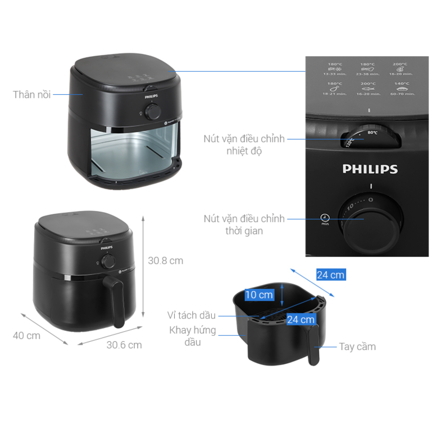 - Điều chỉnh nhiệt độ từ 80 – 200°C và hẹn giờ lên đến 60 phút linh hoạt, phù hợp nhiều món.