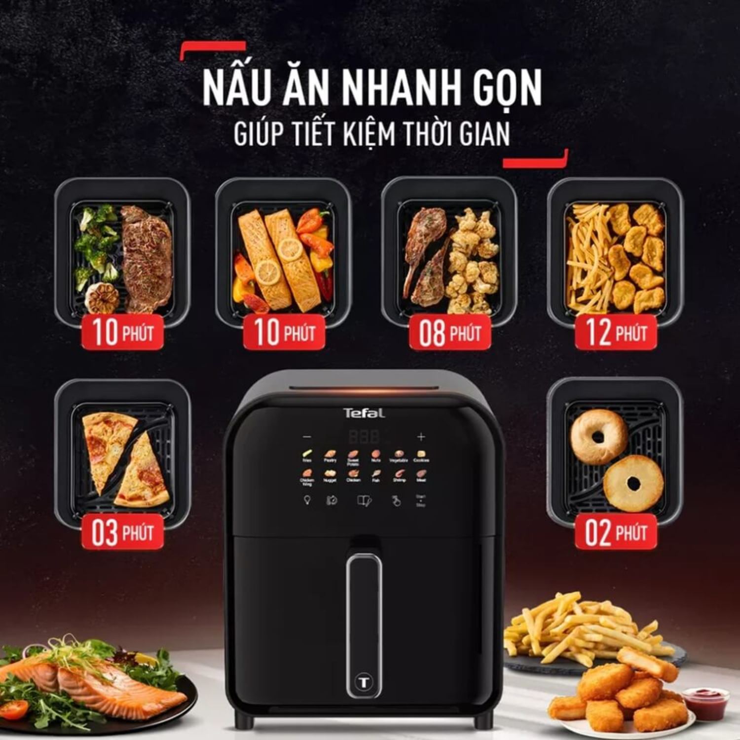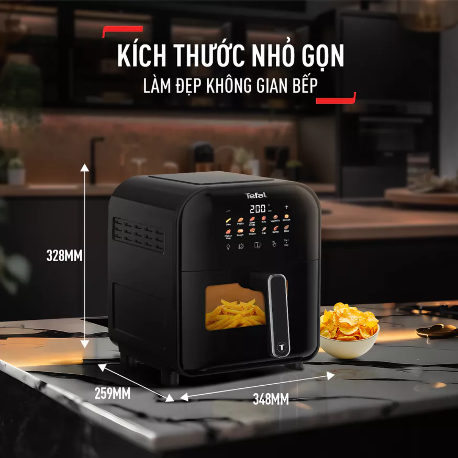 Sản phẩm tích hợp 12 chương trình nấu tự động như chiên khoai tây, gà, cá, rau củ, bánh ngọt, tôm, pizza, giữ ấm,... Giỏ chiên thiết kế lỗ thông hơi đa chiều giúp thức ăn chín đều mà không cần lật trở. Cửa kính cường lực trong suốt dễ dàng quan sát quá trình nấu, không cần mở nồi tránh thất thoát nhiệt, tiết kiệm điện năng.
