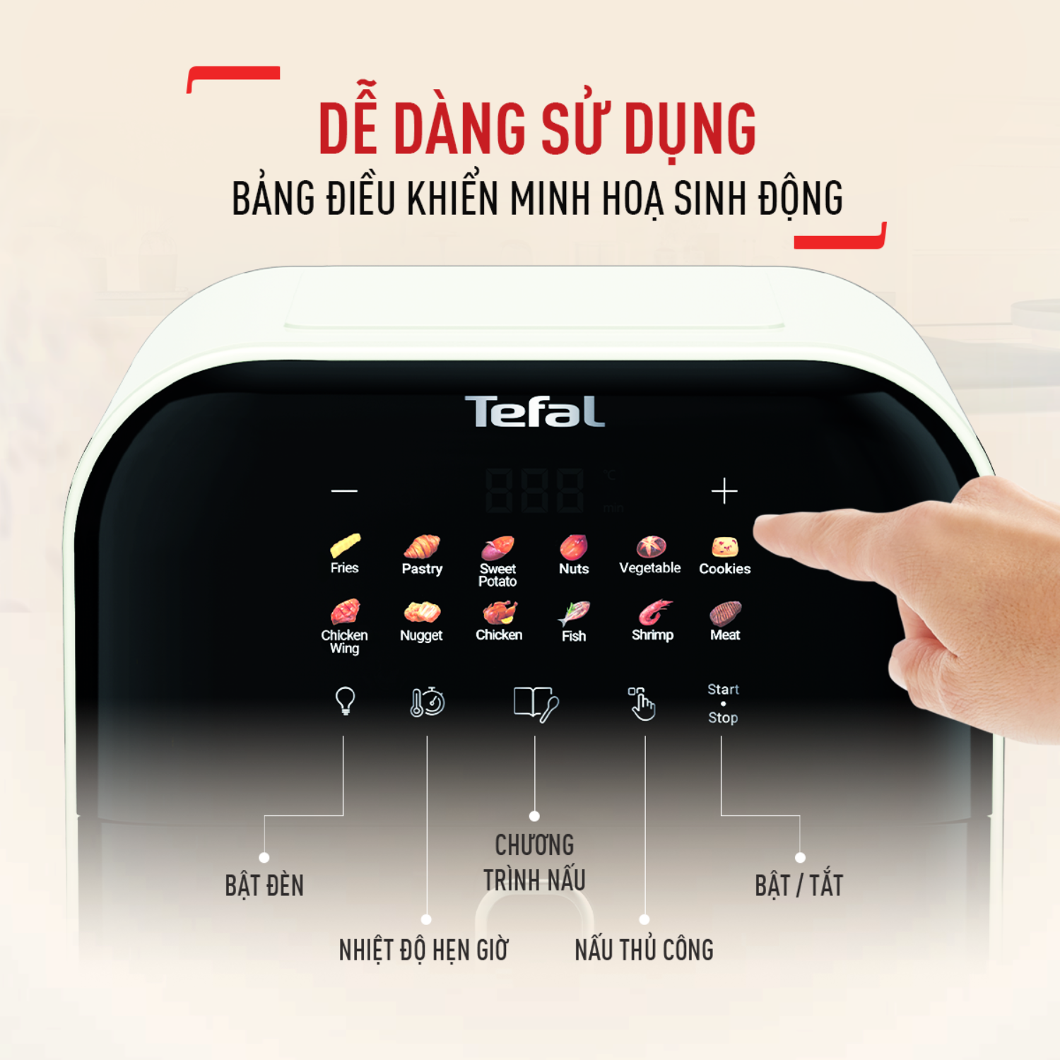 Bảng điều khiển cảm ứng hiện đại, trực quan với các biểu tượng màu sinh động, thao tác dễ dàng cho mọi đối tượng người dùng. Thân và khoang nồi làm bằng thép không gỉ phủ chống dính cao cấp, dễ vệ sinh sau khi sử dụng. Máy có tính năng an toàn tự động ngắt khi quá nhiệt.