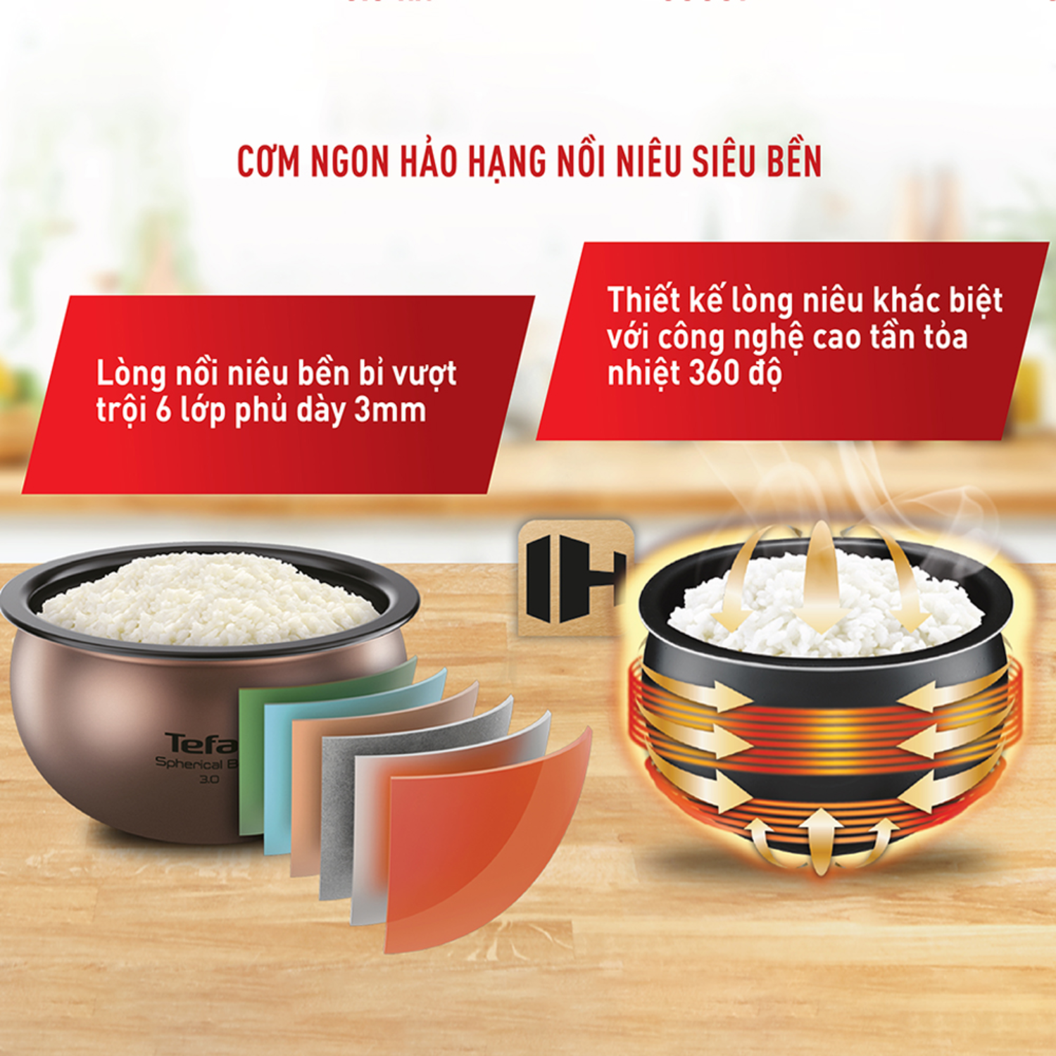 Nồi cơm cao tần Tefal RK762168 dung tích 1.5L sử dụng công nghệ induction heating (IH – cao tần) kết hợp thiết kế nồi hình cầu với lòng nồi hợp kim nhôm dày 3mm, cấu tạo 6 lớp phủ chống dính cao cấp. Công nghệ IH cho phép nhiệt lượng điều chỉnh và lan tỏa đều khắp nồi, giúp hạt cơm chín nhanh, đều, giữ nguyên dưỡng chất và hương vị đặc trưng của từng loại gạo. Thiết kế lòng nồi cầu hỗ trợ cơm không bị nát, dẻo, ngon suốt nhiều giờ.