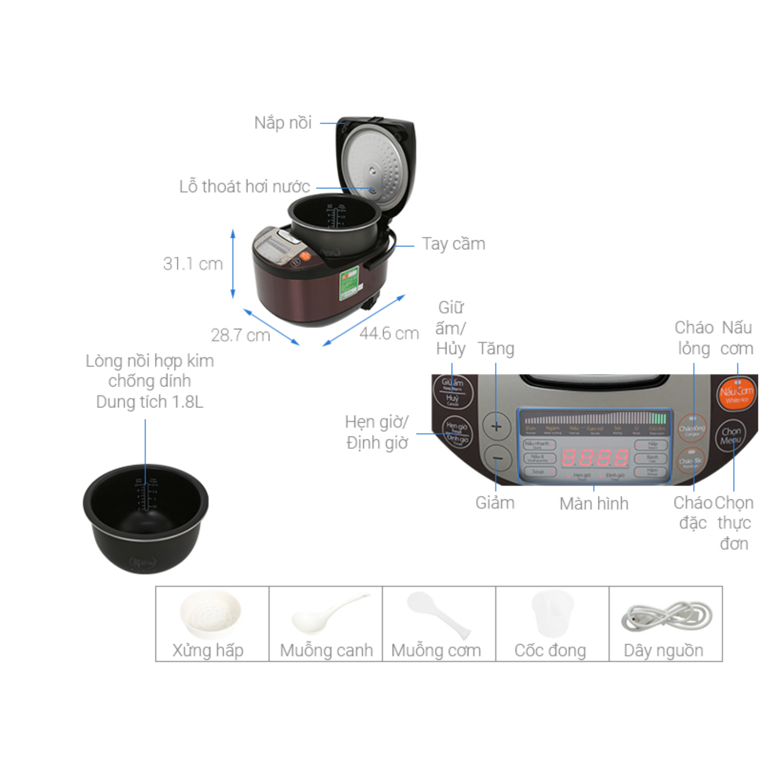 - Phụ kiện đi kèm đầy đủ như muỗng cơm, muỗng canh, cốc đong gạo và xửng hấp tiện lợi.